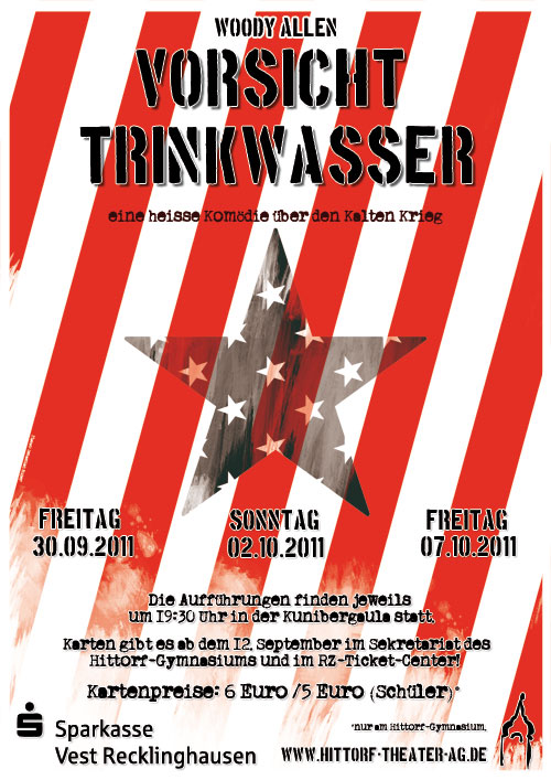 | 2011 stellte sich das Problem, dass der Titel des Stückes überhaupt nichts mit dem Inhalt gemein hatte und daher jedes Motiv mit Wasser überhaupt keinen Sinn gemacht hätte. Daher wurde überlegt, worum es in dem Stück geht und sind zu dem Schluss gekommen, dass es in erster Linie um Amerikaner in einer kommunistischen Botschaft geht. Und so wurden amerikanische und Kommunistische Symbole gsucht und heraus kam der Sowjet-Stern auf Elementen der amerikanischen Flagge... |