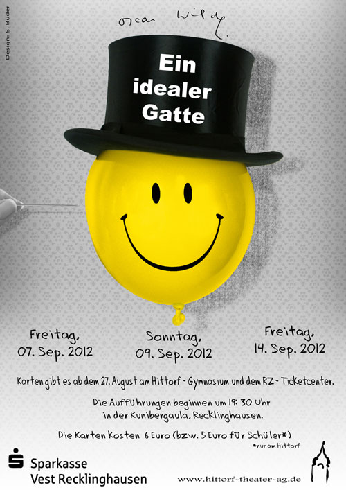 | 2012 gestaltete sich die Suche nach dem idealen Plakatmotiv komplizierte rals gedacht. Schließlich wollte man, wie jedes Jahr, Klischees vermeiden und die Massen dennoch ansprechen. Ein erster Entwurf sah daher vor, Oscar Wilde himself auf das Plakat zu nehmen, dargestellt lediglich durch Buchstaben, die Zitate aus dem Stück bilden. Diese Variante wurde aber von der Mehrheit als zu düster empfunden und verworfen bzw. für die Eintrittskarten verwertet (vgl. dort). Schließlich kam Jana Heidersdorf mit einem gelben Smilie-Ballon, der einen Zylinder trug, zur Charakterkonferenz und inspirierte damit Sebastian Buder zu dem Entwurf. Mit Lucas Hilfe wurde der Ballon ins rechte Licht gesetzt und Fotografiert und auf das Plakat gebannt... Doch irgendwas fehlte noch - ein Objekt, das die Bedrohung im Stück versinnbildlicht und so kam die Nadel hinzu, die, wie Lady Cheveley im Stück, den aufgeblasenen "Idealen Gatten" bedroht... Das Motiv wurde schließlich auch auf Buttons und Flaschenöffner, als internes Merchandising, gepackt und erfreute sich in der Gruppe großer beliebtheit. (Der Namenszug von Oscar Wilde ist übrigens seine echte Unterschrift.) | ||