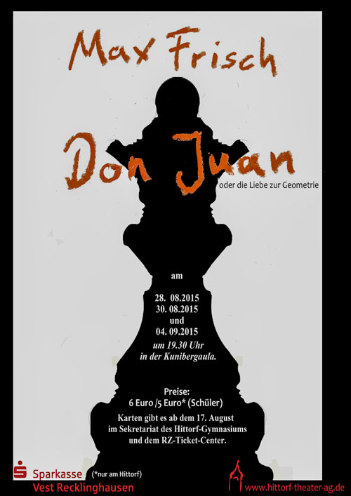 | Dieses Plakat sollte ursprünglisch schwarz/weiß werden. Auf Grund von Unkenntnissen im Offsetdruck, der beim 2-Farbdruck nicht zwingend das darstellt, was der Computer einem vor macht, bekam es dann leider diesen Rotstich. Im Endeffekt fand man sich aber dann damit ab. Das Foto stellt die beiden Protagonisten, dargestellt durch Helen und Adrian, dar. Das Foto wurde von Julia Grunschel gemacht und anschließend im Computer manipuliert. Im unteren linken Teil taucht zum ersten Mal das neue Logo für die hittorf-Theater-AG auf, welches das Hittorf-Türmchen symbolisiert und mit Aquarell ursprünglich in blau gezeichnet wurde. |