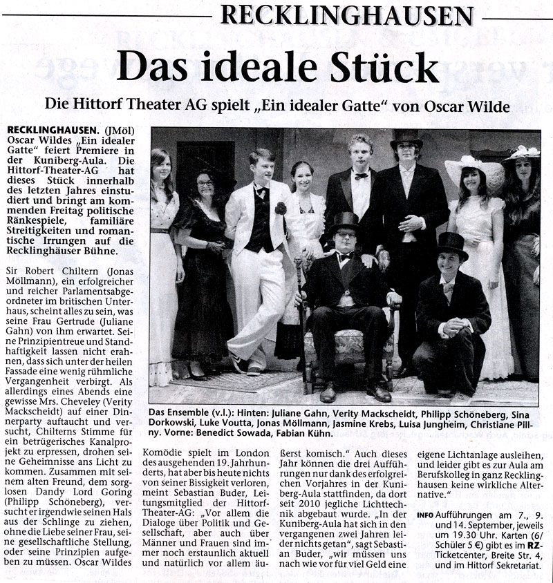 Die Presse: traditionell Freund und Feind des Künstlers. Da kann ein Artikel die Häuser füllen und Karrieren beginnen lassen und der nächsten selbige genauso schnell beenden... Zum Glück, können wir uns nicht beklagen und daher präsentieren wir mit Freude und nicht ohne Stolz, eine Auswahl der Presseartikel aus den vergangenen Jahren...und ganz im Vertrauen, für jeden Schauspieler, und sei er noch so bescheiden, ist es das Größte, einmal seinen Namen in der Zeitung zu lesen oder sich auf einem Foto zu sehen - ein Gefühl, das nur noch durch den Schlussapplaus getoppt werden kann... Abkürzungen: RZ - Recklinghäuser Zeitung KzS - Kurier zum Sonntag WAZ - Westdeutsche Allgemeine Zeitung FAZ - Frankfurter Allgemeine Zeitung |