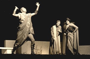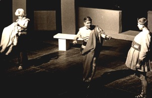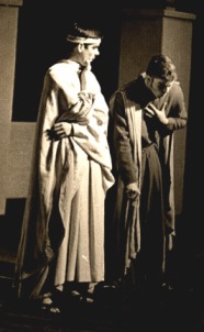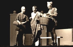 Regie/Leitung: Friedich Neugebauer Ort: städtischer Saalbau, Recklinghausen Anlässlich der 60-Jahr-Feier des Hittorf-Gymnasiums wird am 3. Oktober 1964 die Verwechslungskomödie "Die Zwillinge" von Plautus gezeigt. Die Kostüme klassisch, das Bühnebild offensichtlich reduziert modern, ist sonst nicht viel über die Inszenierung überliefert. Dafür aber immerherhin einige Bilder. Man beachte vor allem den Römer mit dem dicken Bauch - ein ähnliches Kostüm findet sich 2004 in dem Stück "Cäsar und Cleopatra" wieder, das anlässlich der 100-Jahr-Feier gezeigt wurde. Ob es sich dabei um ein Kostüm aus dem selben Verleih handelt ist leider nicht klar. Dank an Winfried Gellert für das Fotomaterial. |