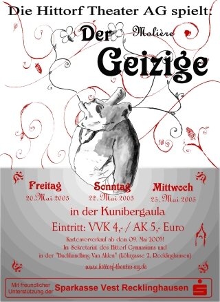| Das Plakat zum Geizigen entstand auf Umwegen. Der Theorie folgend, dass die erste Idee die schlechteste sei, wurde ein Motiv gewählt, welches im ersten Moment scheinbar nichts mit dem Thema zu tun hat. Die Idee ist, Motiv und Titel in Kontrast zu stellen, um den Betrachterblick zu fangen. Es wird ein naturalistisches Herz, welches grau ist, gezeigt, aus dem zwei Pflanzen sprießen. Im Druck sind die Fraben golden, welches zum einen mit dem Thema "Geiz" harmoniert, zum anderen einfach die Lust des Künstlers befriedigte: Einmal ein Plakat mit Gold zu gestalten. Gezeichnet wurde das Motiv wieder mit Tusche und Feder. |