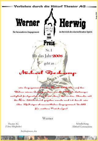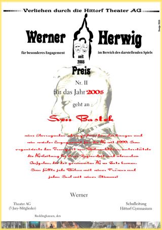 Aufgrund des Jubiläums im letzten Jahr und in Hinblick auf die kurze Saison (November-Mai) beschloss die Jury des Werner Herwig Preis im ersten Jahr seiner Vergabe zwei ehrenamtliche Mitglieder der Theater AG zu würdigen. Michael Rieskamp bekam den Preis für "sein Engagement in der AG seit 1992. Was auf der Bühne seinen Anfang nahm, wurde 1997 als Leitungsmitglied fortgesetzt. Er ist ein Mann der ersten Stunde, seit die AG in Schülerhand gegeben wurde und ist durch sein über 13jähriges ehrenamtliches Engagement Vorbild für weitere Preisträger!" Sven Bastek erhielt die Ehrung für "seine überragenden schauspielerischen Leistungen und sein soziales Engagement für die AG seit 1999. Sven organisierte den Transport von Bühnenbildern, unterstützte die AG-Leitung bei ihrer Regiearbeit und übernahm Aufgaben, die der gesammten AG zu Gute kamen. Sven füllte jede Bühne mit seiner Präsenz und jeden Saal mit seiner Stimme!"