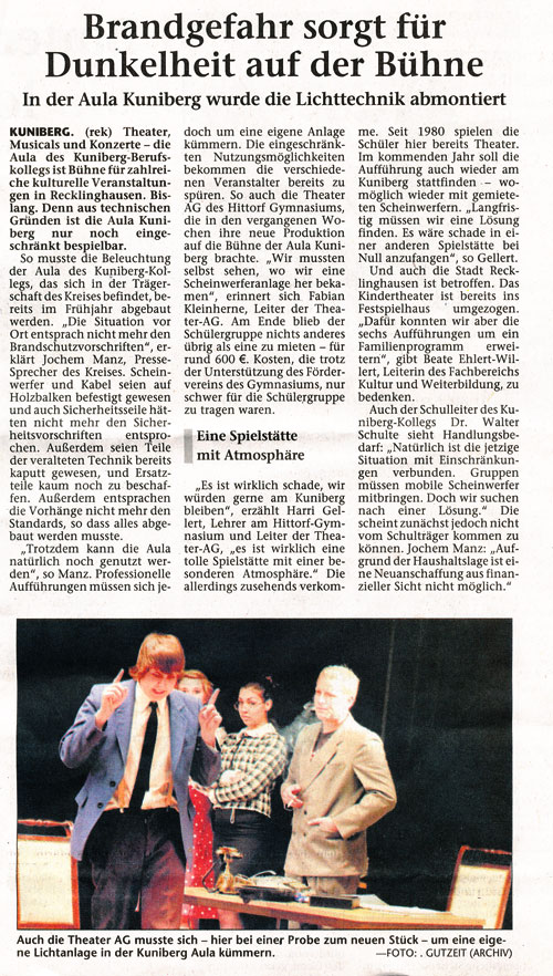 Während sich die Kulturhauptstadt 2010 mit gelben Ballons und gesperrten Autobahnen feiert, fehlt es in den Städten des Ruhrgebiets zunehmend an Geldern. Die Kassen sind leer, was nicht nur dazu führt, dass namhaften Bühnen, wie in Essen oder Wuppertal, die Schließung droht, sondern es auch dem Amateurtheater zunehmend schwieriger gemacht wird, Kultur anzubieten. Seit Jahren kämpfen wir und andere Theatergruppen, welche die Kunibergaula als einzigen Spielort in Recklinghausen haben, mit der maroden Technik. 2010 wurde diese gänzlich entfernt. Es gibt in der Aula weder Scheinwerfer, noch die Möglichkeit einer Aufhängung. Dies hat zur Folge, dass wir die Technik mieten müssen, womit unser Budget mehr als ausgereizt ist.