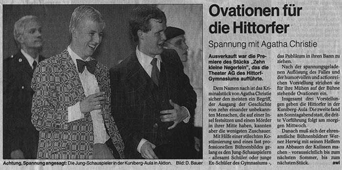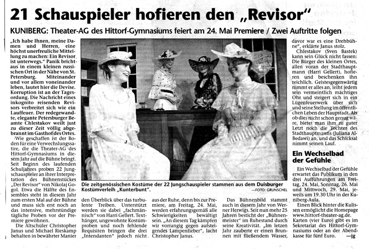 Einmal schlafen und dann ist es wieder soweit: Die Hittorf-Theater-AG goes Kuniberg! Die LKW sind gepackt. Die Darsteller hochmotiviert! Und die Leitung voller Tatendrang! Einmal schlafen und der Kartenverkauf beginnt! Wer nicht die Möglichkeit haben sollte, am Hittorf Karten zu erstehen, kann dies, wie immer, über den Webmaster tun. Und bereits jetzt: Die neuen Ensemble-Fotos und das neue Foto des Monats!