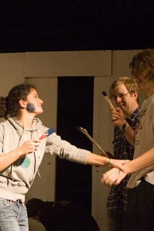 Außerdem wird unser Ensemble, neben der Probenarbeit, theaterpädagogisch fit gemacht. Freia Köster, zur Zeit Referendarin am Hittorf Gymansium zeigt unseren Schauspielern mit Erfolg, dass Theaterspielen weit mehr als nur Textlernen ist. Bei Sprachübungen, Improvisationen und Charakterkonferenzen werden bei unseren Jungdarstellern Talente geweckt, die sie vorher selbst nicht in sich schlummern ahnten. Und dass der Spaß dabei nicht zu kurz kommt, zeigt nicht zuletzt eine spontane Polonaise durch die Schule...
