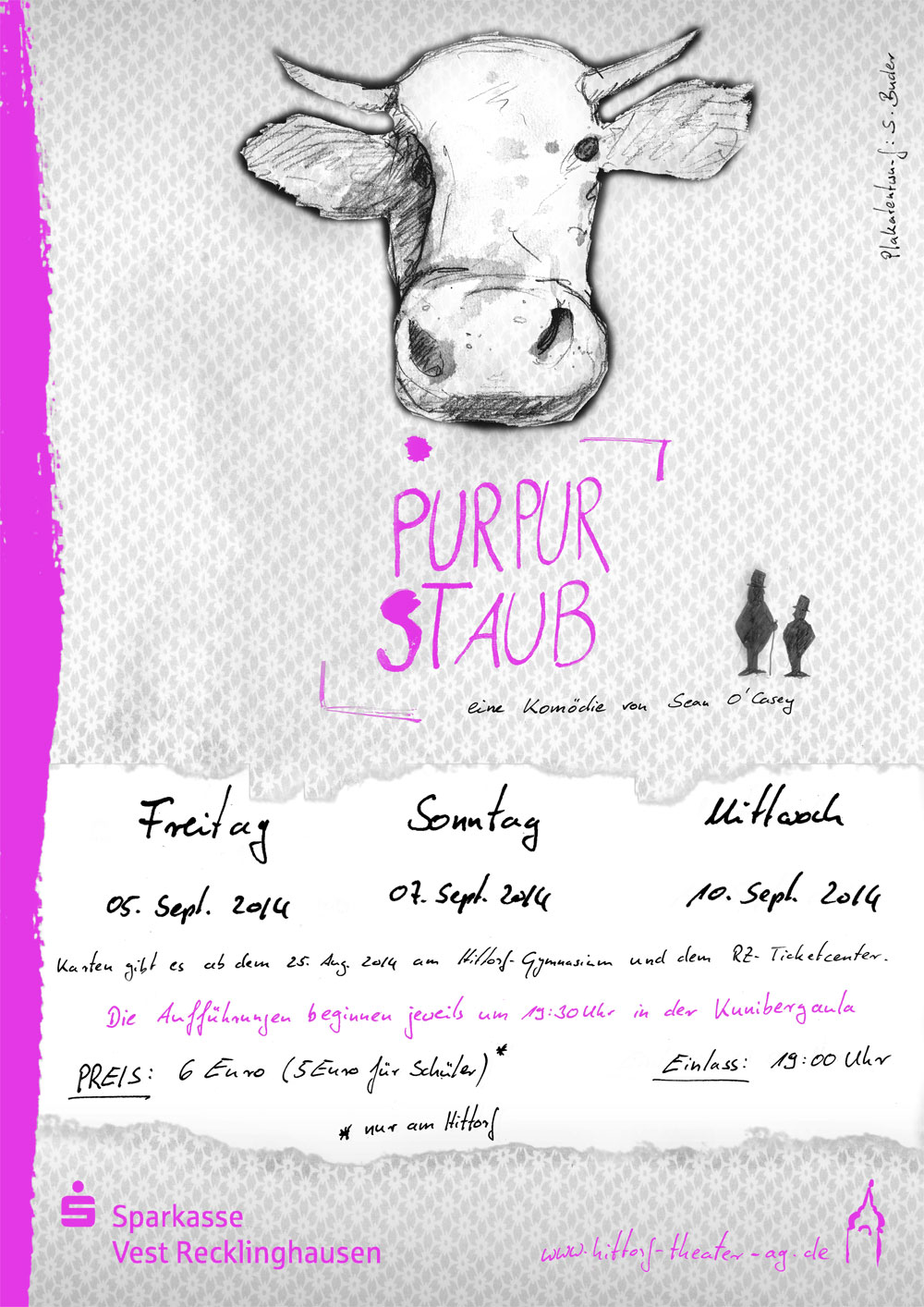 2014 spielt die AG "Purpurstaub" von Sean O'Casey und an alle aufmerksamen Theaterbesucher, die das Stück (oder besser: eine Version des Stückes) bei den Ruhrfestspielen gesehen haben: Wir bleiben weit unter 4 Stunden, es gibt eine Pause und wer in der Hartmann-Version den Plot vemisst hat, kann dies bei uns nachholen.