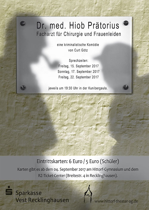 | 2010 führt die AG das Kriminalstück "Zeugin der Anklage" von Agatha Christie auf und das Stück in den 60er Jahren spielt passt sich das Plakatdesign im Stil der guten alten Groschenromane dieser Epoche an. Da das Plakat schon etwas verschlissen wirkt, passierte es, dass ein Geschäft, in dem wir es aufhängen wollten, die "Falten" raus zu bekommen... | ||