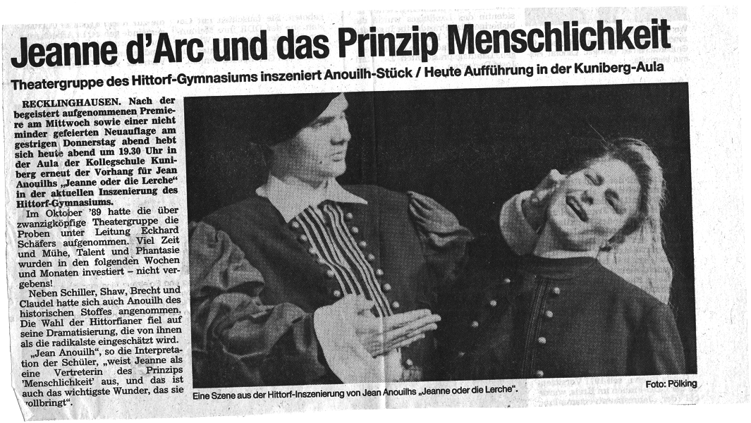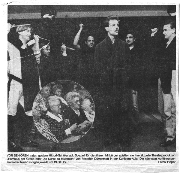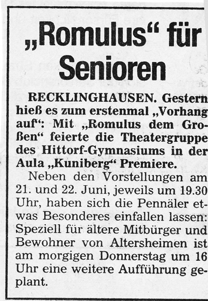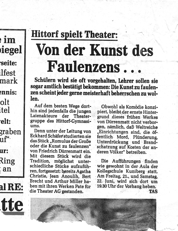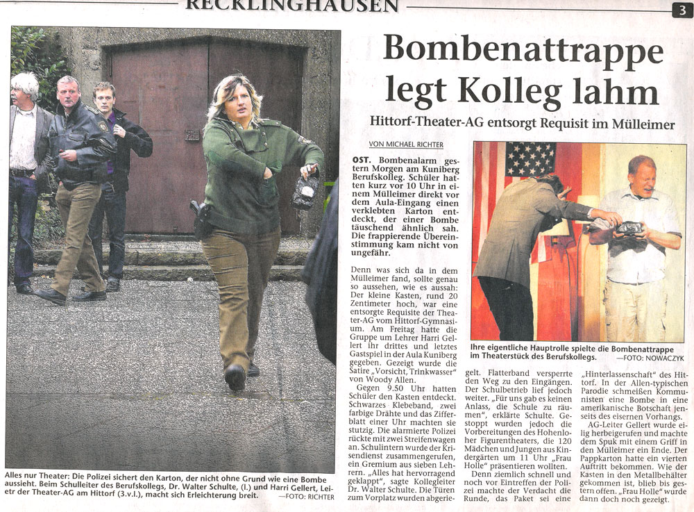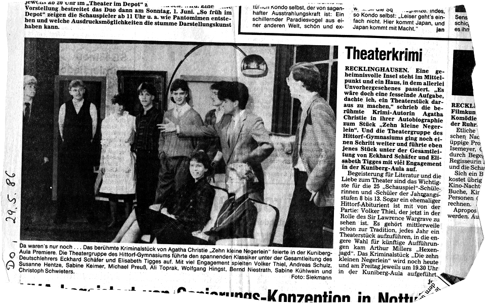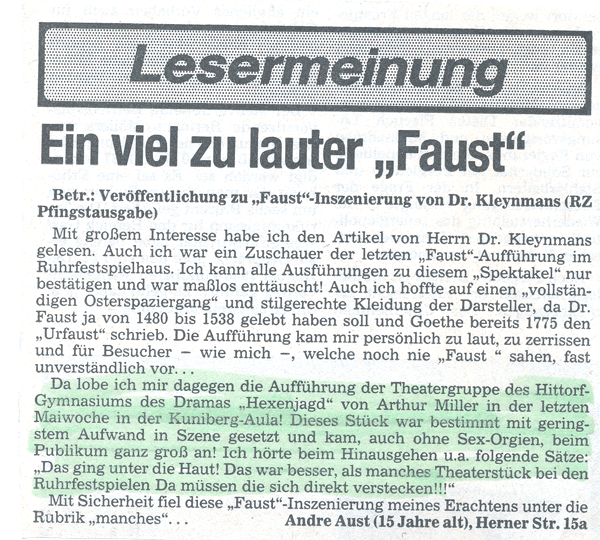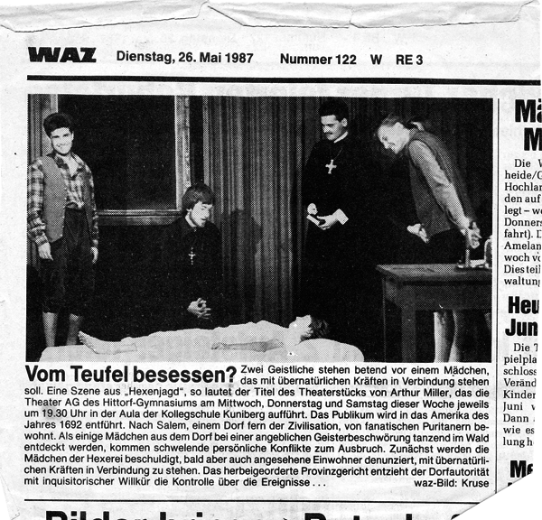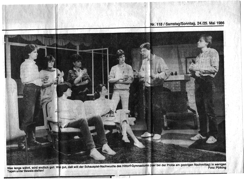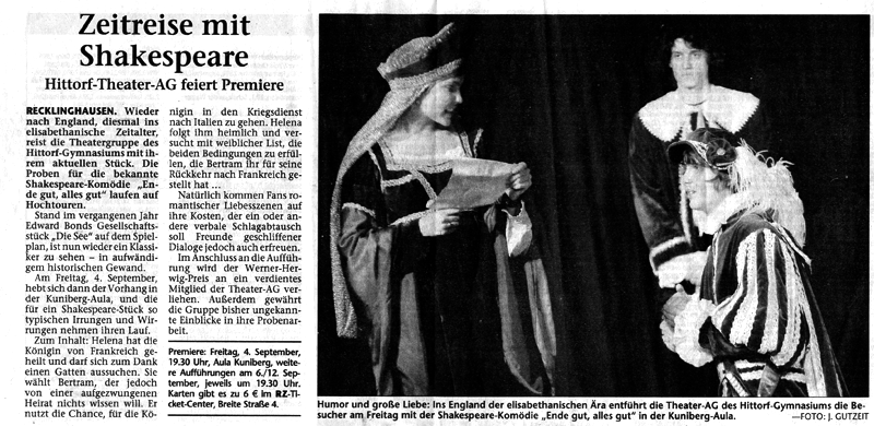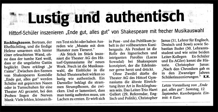 Die Presse: traditionell Freund und Feind des Künstlers. Da kann ein Artikel die Häuser füllen und Karrieren beginnen lassen und der nächsten selbige genauso schnell beenden... Zum Glück, können wir uns nicht beklagen und daher präsentieren wir mit Freude und nicht ohne Stolz, eine Auswahl der Presseartikel aus den vergangenen Jahren...und ganz im Vertrauen, für jeden Schauspieler, und sei er noch so bescheiden, ist es das Größte, einmal seinen Namen in der Zeitung zu lesen oder sich auf einem Foto zu sehen - ein Gefühl, das nur noch durch den Schlussapplaus getoppt werden kann... Abkürzungen: RZ - Recklinghäuser Zeitung KzS - Kurier zum Sonntag WAZ - Westdeutsche Allgemeine Zeitung FAZ - Frankfurter Allgemeine Zeitung |