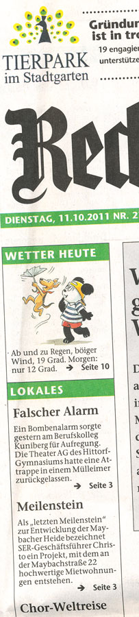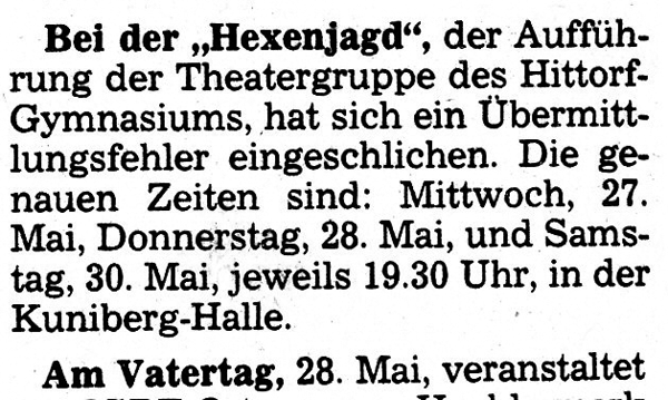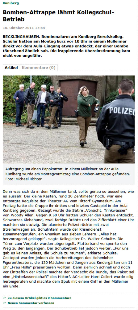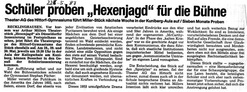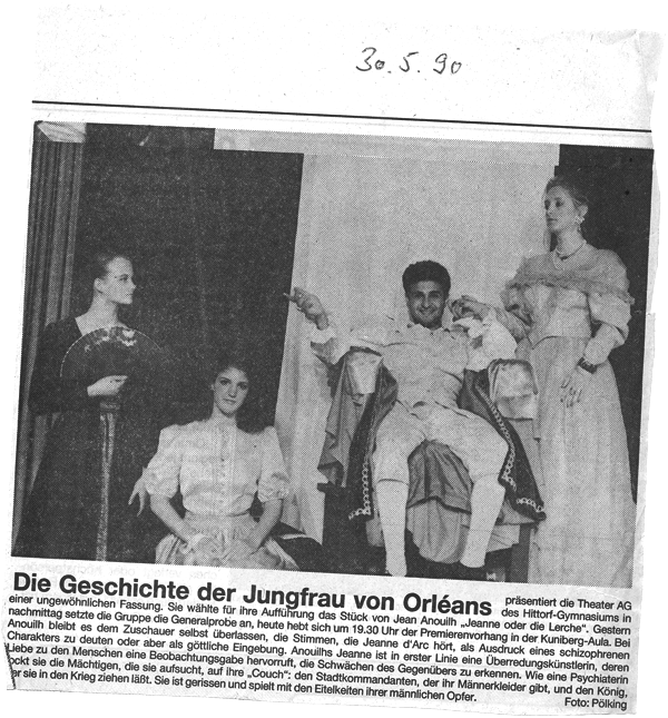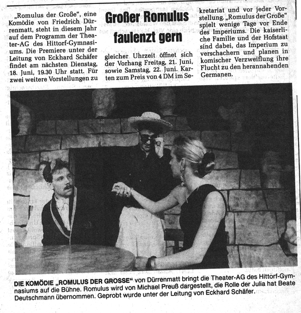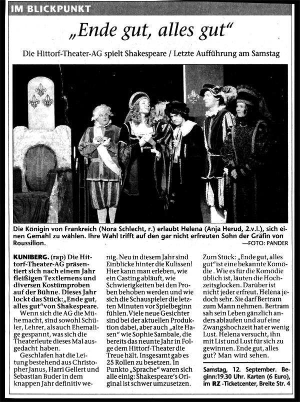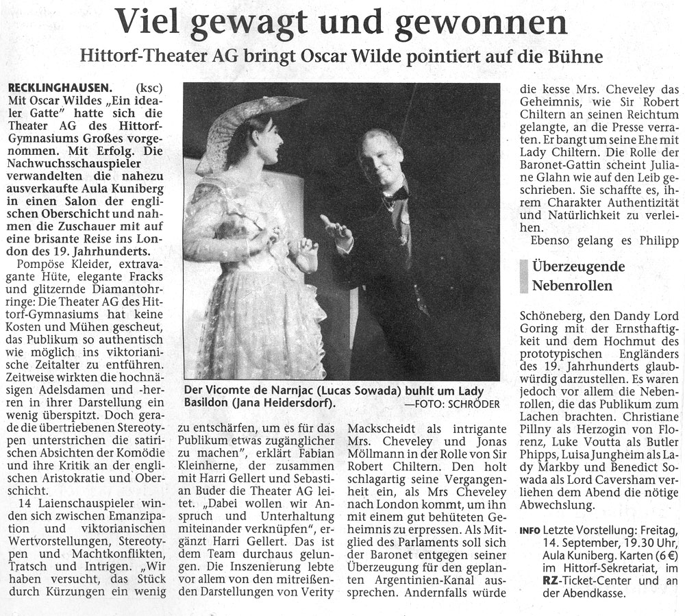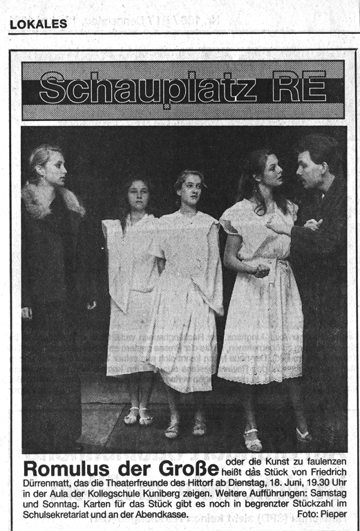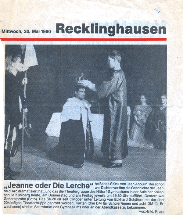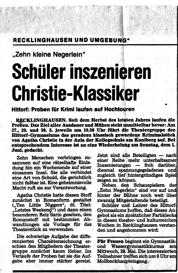 Die Presse: traditionell Freund und Feind des Künstlers. Da kann ein Artikel die Häuser füllen und Karrieren beginnen lassen und der nächsten selbige genauso schnell beenden... Zum Glück, können wir uns nicht beklagen und daher präsentieren wir mit Freude und nicht ohne Stolz, eine Auswahl der Presseartikel aus den vergangenen Jahren...und ganz im Vertrauen, für jeden Schauspieler, und sei er noch so bescheiden, ist es das Größte, einmal seinen Namen in der Zeitung zu lesen oder sich auf einem Foto zu sehen - ein Gefühl, das nur noch durch den Schlussapplaus getoppt werden kann... Abkürzungen: RZ - Recklinghäuser Zeitung KzS - Kurier zum Sonntag WAZ - Westdeutsche Allgemeine Zeitung FAZ - Frankfurter Allgemeine Zeitung |