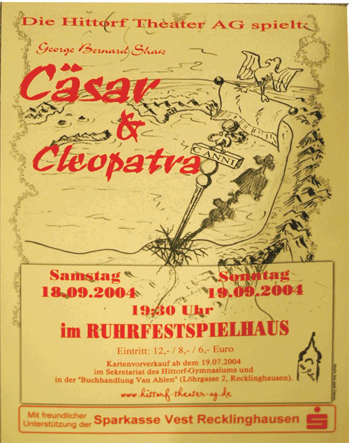 | 2004 ist das Jahr der Superlative: Das Hittorf feiert sein 100jähriges bestehen und die AG möchte diesem Ereignis den nötigen Glanz verleihen. Ein Resultat dieses Größenwahns ist die Idee, zwei Plakate in Umlauf zu bringen. Die erste Version wurde im traditionellen Offsetverfahren hergestellt und warb für die Aufführungen im Festspielhaus ab dem Zeitraum kurz vor den Somemrferien. Als Motiv diente, wie unschwer zu erkennen, die klassiche erste Seite der Asterix-Comics und deutet damit auf eine komödiantische Bearbeitung des Stoffes hin. Die Zeichnung entstand in Tusche und wurde auf beiges Papier gedruckt. |