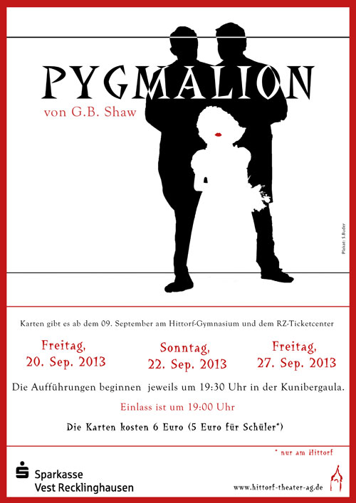 In diesem Jahr finden sich die drei Protagonisten, Higgins, Pickering und Eliza, als Schattenriss auf dem Plakat wieder. Die Vorlage für die Schatten sind Fotos aus dem vergangenen Jahr, wodurch Higgins und Pickering tatsächlich die Umrisse von Philippe (links) und Benedict (rechts) darstellen. Da Laura 2012 noch nicht dabei war, wurde Jasmines Umriss kurzerhand zu Eliza. Der Blumenkorb ist nachträglich reinretouchiert. Peinlich an dem Plakat ist jedoch, dass ein "f" vergessen wurde (in dieser Version korrigiert). Man versuchte es sich damit schön zureden, dass es in dem Stück schließlich um Sprache ging und der dicke Rechtschreibfehler insofern darauf verwiese... wer's glaubt... | |