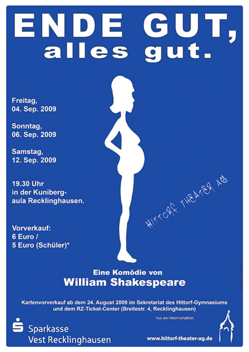 | 2009 ist das Motiv einem Parkplatzschild für Schwangere entlehnt. Bewusst schlicht gehalten soll es so die Aufmerksamkeit der Passanten auf sich ziehen. Die Schwangere ist zum einen die Vorwegname des Stückendes und zum anderen eine Refferenz zum Titel. | ||